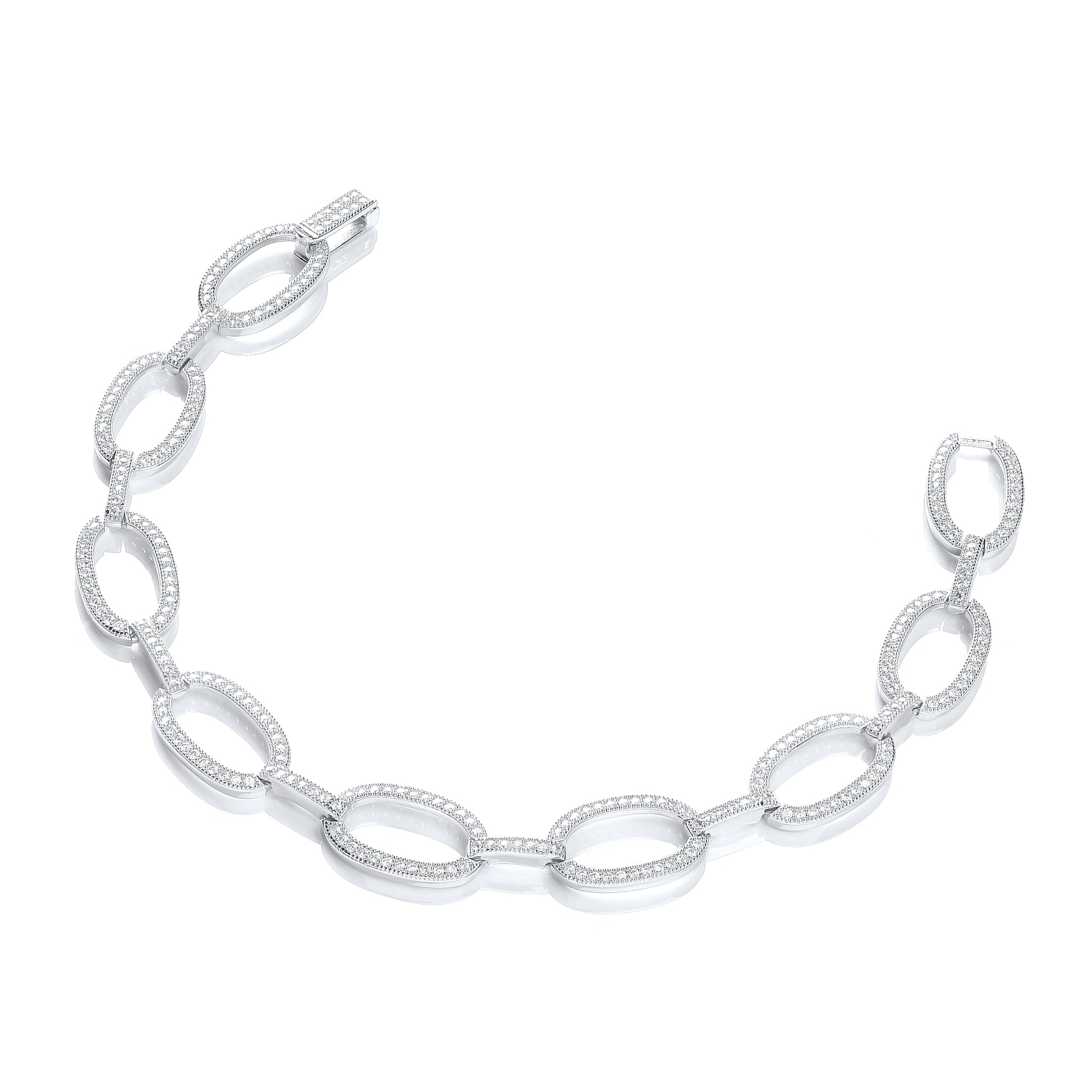 Solid silver oval link bracelet set with cubic zirconia stones.