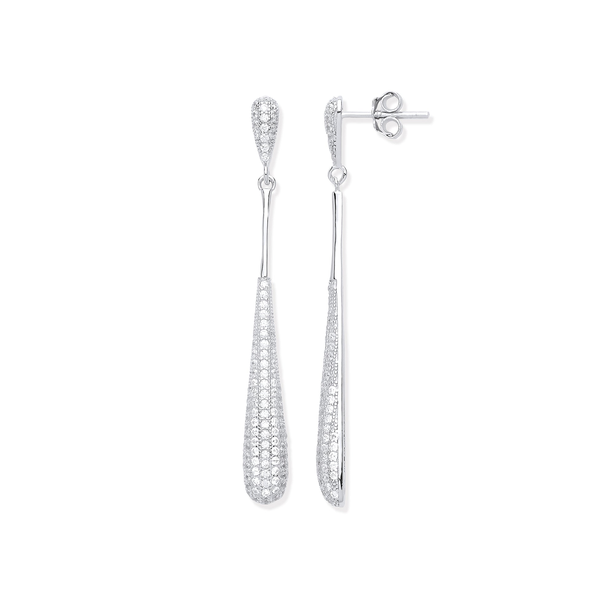 Sterling silver earrings set with brilliant cut cubic zirconia stones in a teardrop shape. Width: 5.4mm Length: 48.0mm.